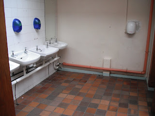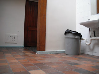 View from the entrance into the bathroom. This is where the victim meets his demise, and the janitor discovers the corpse.
